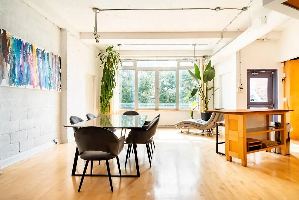 Complete with a sitting area, Mileend - Huge Bright & Modern Loft Suite - Kingbed is furnished with sound-proofed windows and provides amenities like climate control. Along with a TV, guests may also use a sofa set and a work desk for comfort and relaxation. Featuring a walk-in shower and a separate toilet, a bathroom provides a hairdryer and bath sheets.